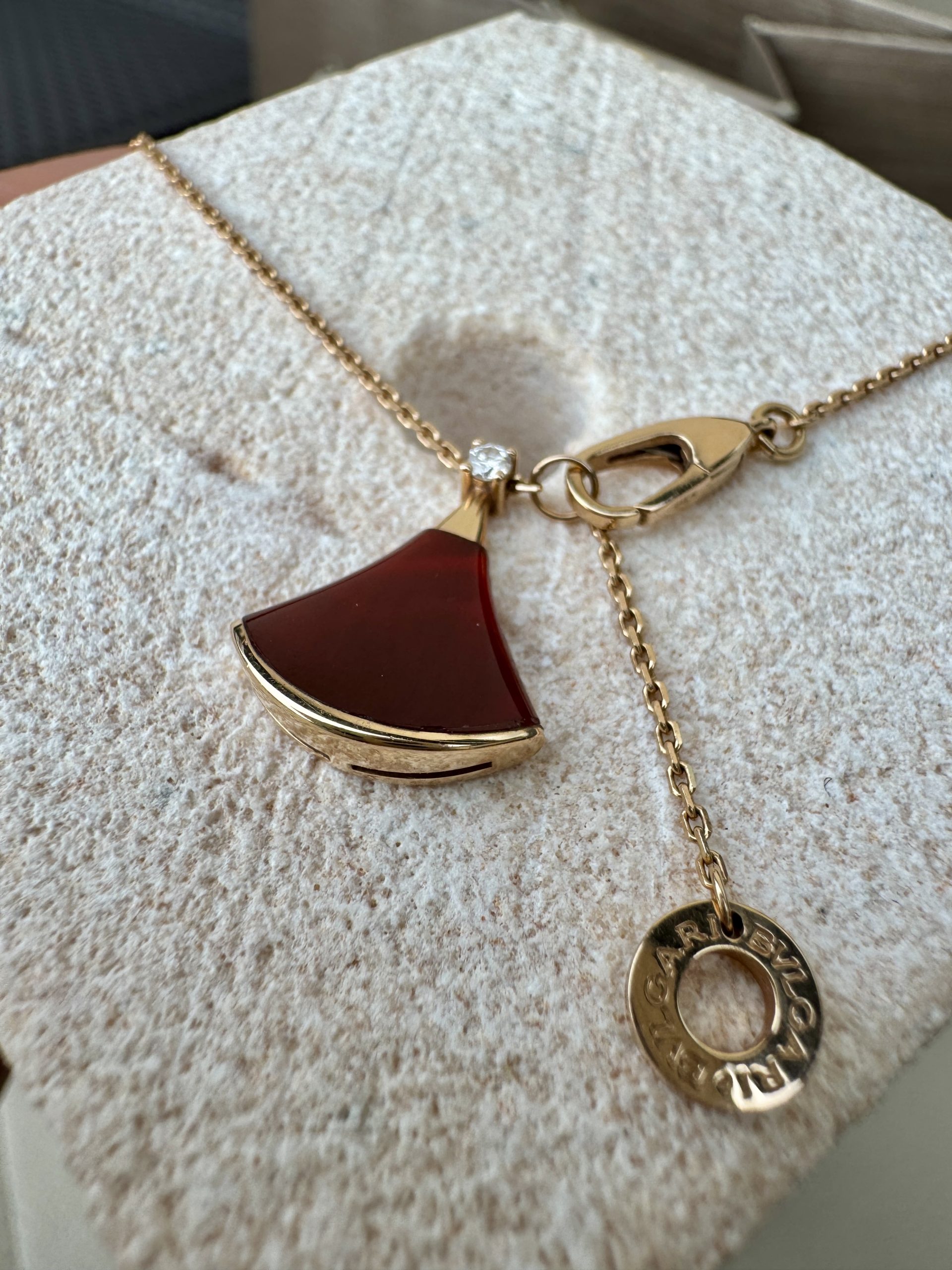 Bvlgari Divas’ Dream necklace in 18 kt rose gold with 18 kt rose gold pendant set with one diamond and carnelian.