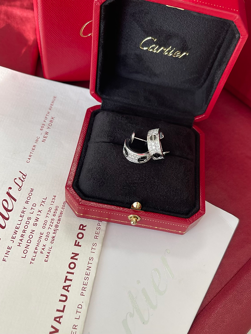 These stunning Cartier Love earrings are set in 18k white gold with pavé round brilliant cut diamonds and beautifully contrasted with the black ceramic screw motif. These hoop earrings come with butterfly backs.