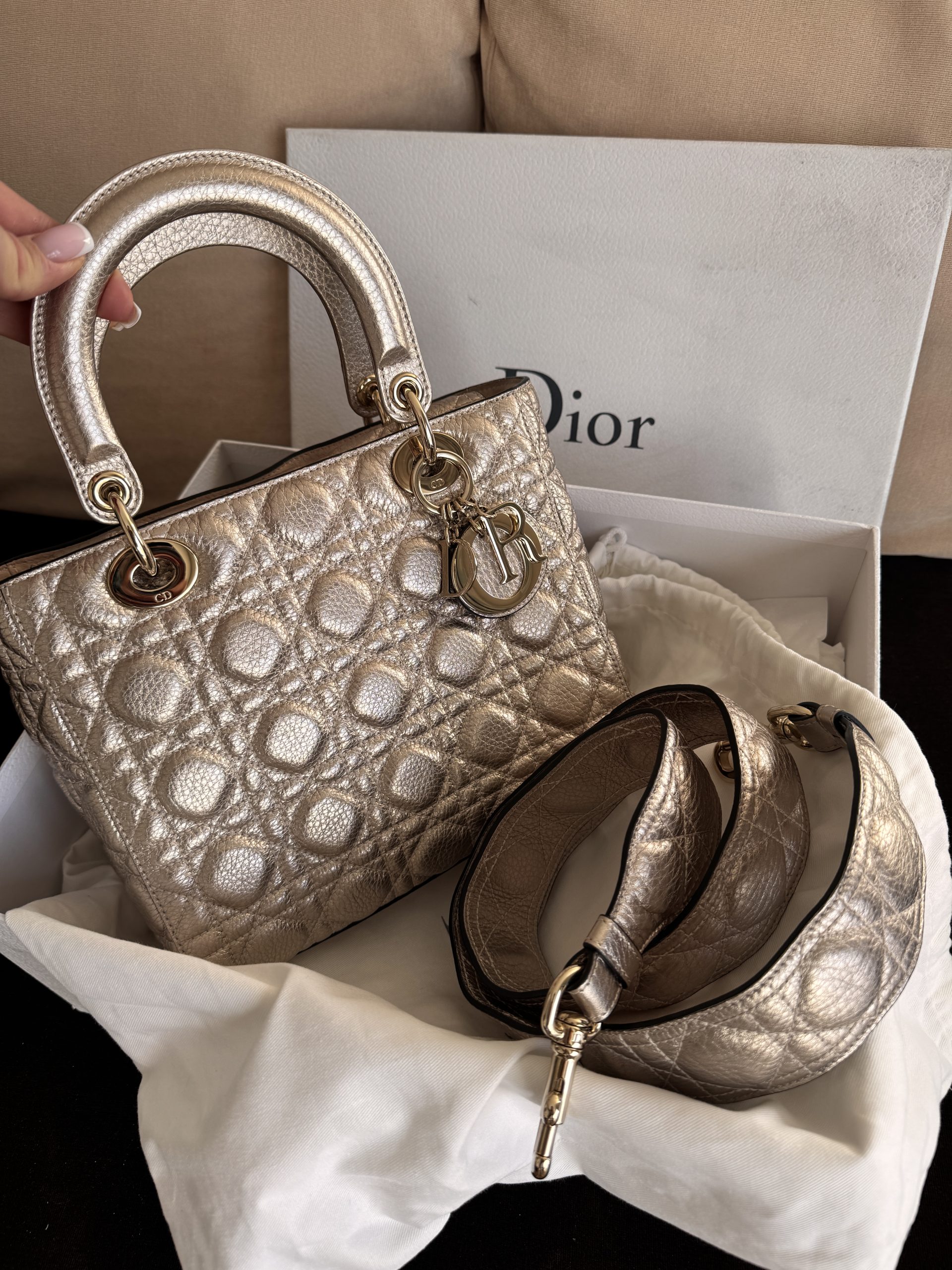 Be the first to review “Champagne Metallic Lady Dior Calfskin Medium Bag with Strap” Cancel reply