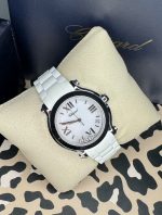 Stainless steel case with a white rubber strap. Fixed stainless steel bezel. White dial with 3 floating diamonds with silver-tone hands and stick hour markers. Roman numerals mark the 3, 6, 9 and 12 o’clock positions.