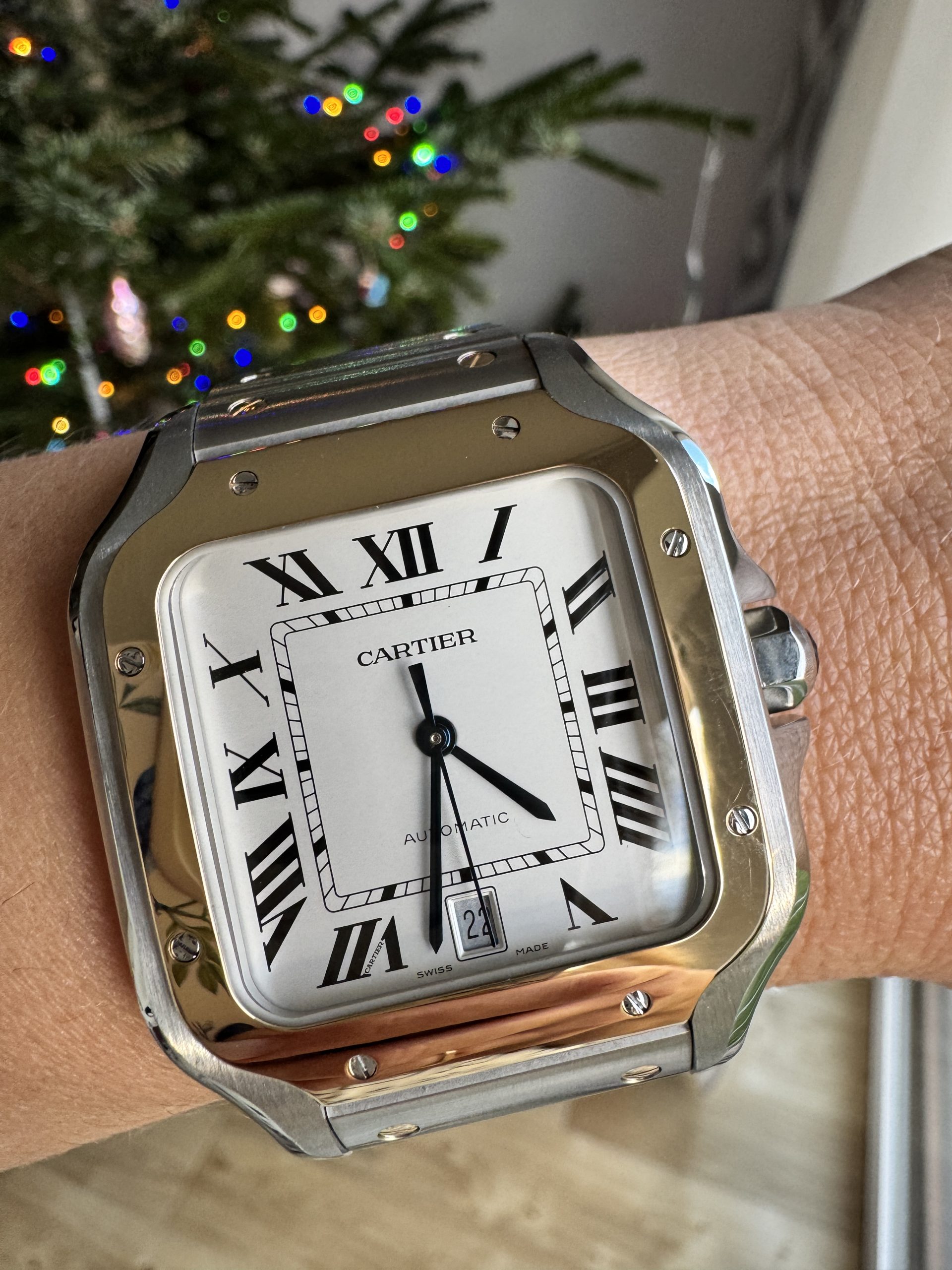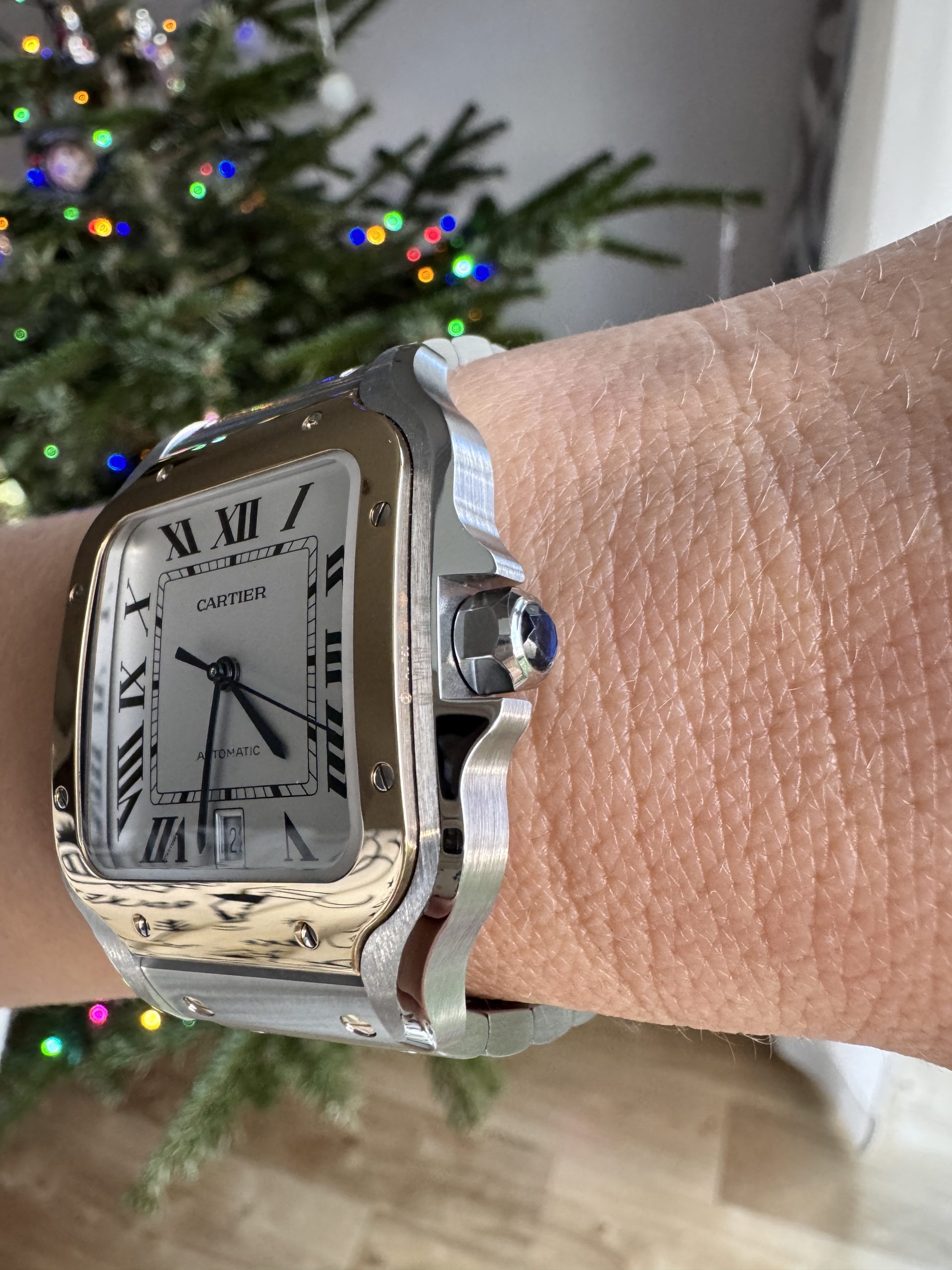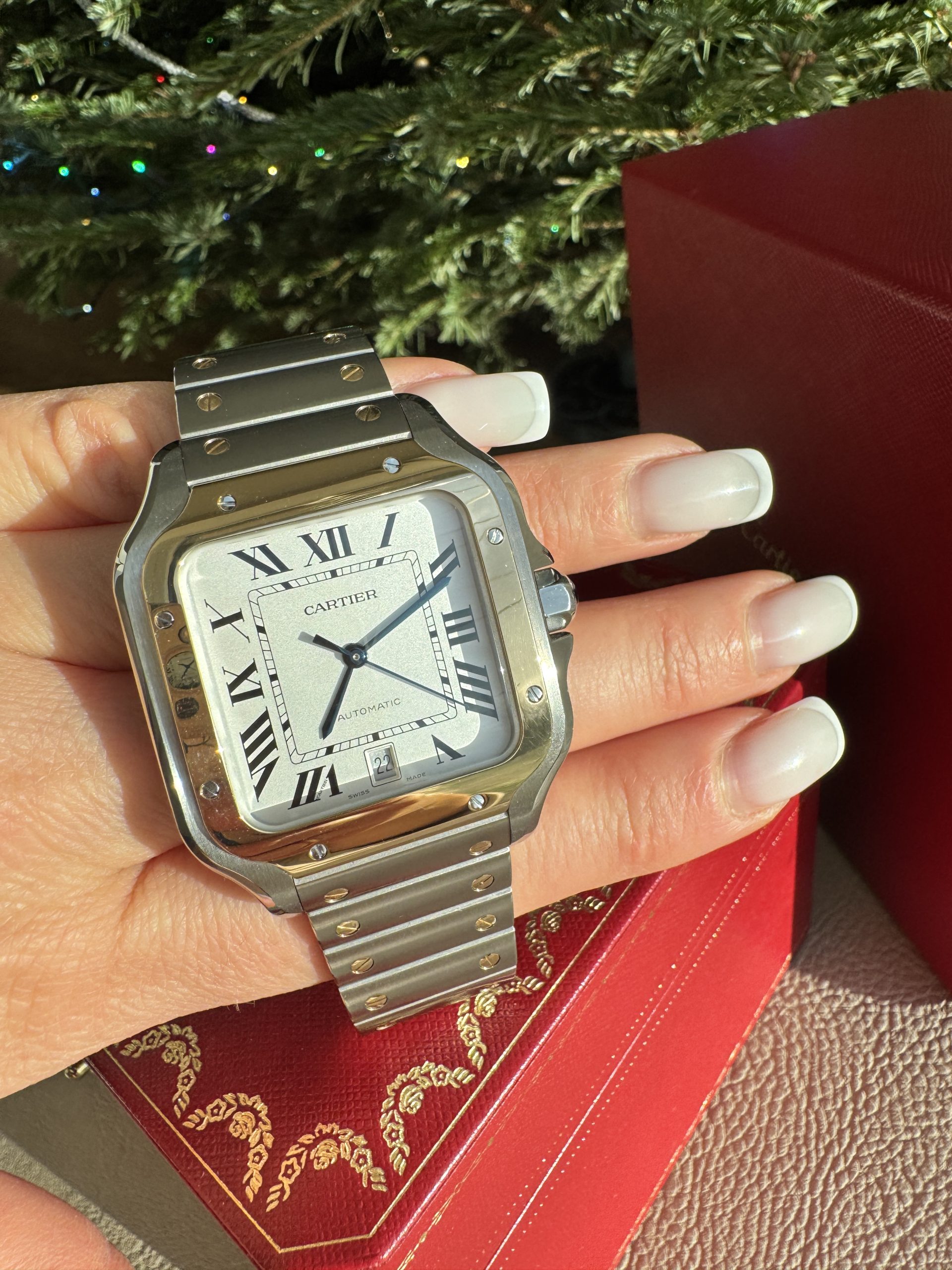 Santos watch, large model, mechanical movement with automatic winding, calibre 1847 MC. Steel case and yellow gold 750/1000 bezel, 7-sided crown set with a faceted synthetic spinel, silvered opaline dial, blued-steel sword-shaped hands, sapphire crystal. Steel bracelet with “SmartLink” adjustment system. Second bracelet in calfskin, with interchangeable steel folding buckle. Both bracelets are fitted with the “QuickSwitch” interchangeability system. Case width: 39.8 mm, thickness: 9.38 mm. Water-resistant to 10 bar (approx. 100 metres).